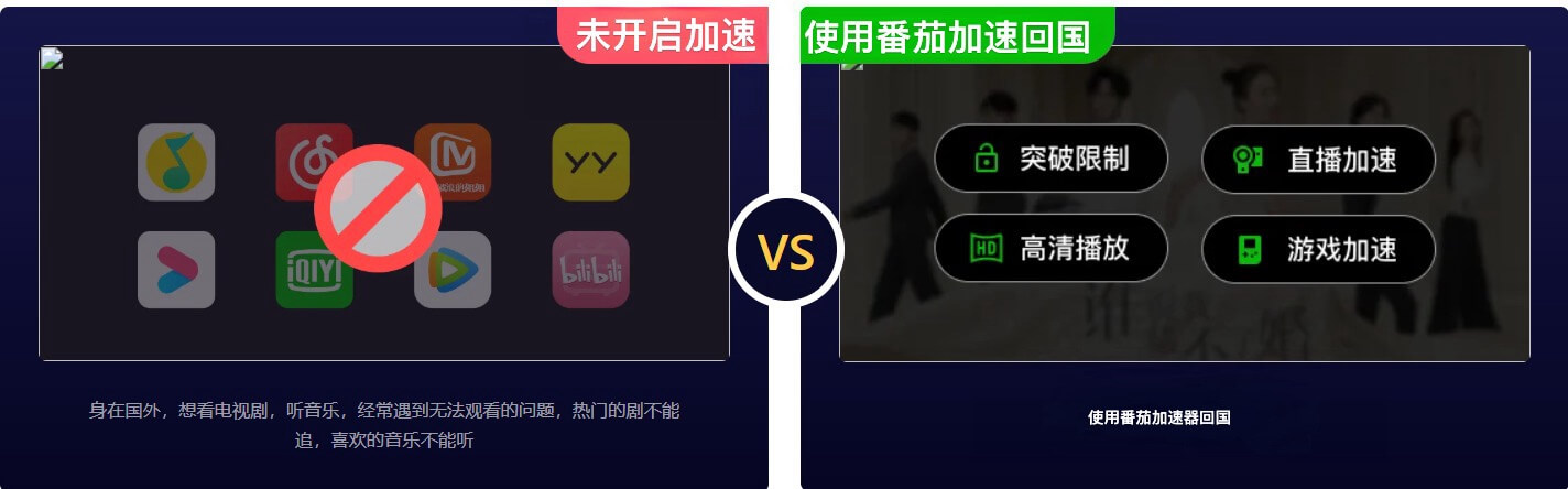 当您身处海外,想用腾讯视频或网易云音乐追剧或听歌的时候,突然发现视频或音乐无法访问不能播放。使用番茄,帮助您一键加速音视频,畅快回国。